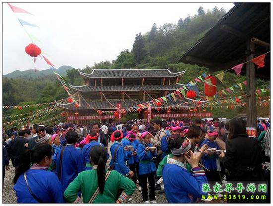 二、訪苗山:徒步經峽谷上對歌臺,登龍脊山百步石頭天梯,觀奇異風水“三龍奪寶”,賞龍鱗樹“九龍迎賓”,攔門酒、攔門歌、攔門鼓,參觀苗寨人家,在山崖邊的“情人坡”樹蔭下納涼,觀數人合抱的“九世古樹”、草帽大的“靈芝”,參與互動的民俗表演。苗家中餐(農家飯,迎客酒)后游神龍峽,走在鄉(xiāng)間的小路上,小溪、田埂,別有一番趣味,乘船返長潭崗。