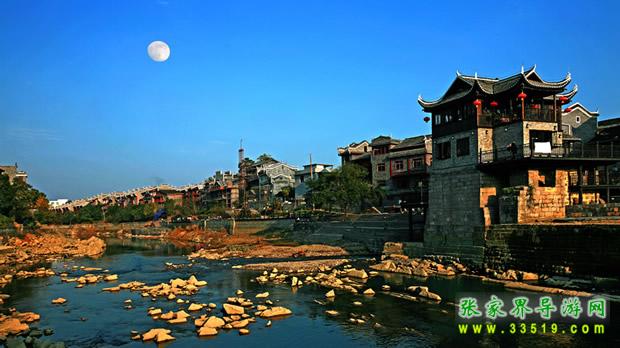 乾州古城城池小巧玲瓏,石城墻垣逶迤回環(huán)1980m,高5m,方溶江穿城而過,沿江古街上被歷代行人的腳磨得光亮的青石板,既自然又精巧地鑲嵌著,沿街建有苗族特有的民宅——吊腳樓,具有濃郁的民族風(fēng)格。