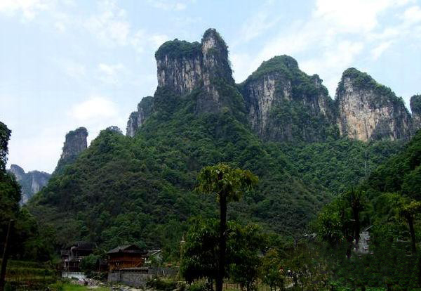 從玉鉆峰沿公路向北行2公里,但見溪谷兩岸石壁陡峭如削,高千仞,絕壁間石紋如畫,青白相間,加上有古木翠草點綴,如同畫屏。這就是“天門畫壁”。走過“天門畫壁”,便見三座石峰緊緊相連,這就是“相依巖”。高200余米,活象三個石人相依而立,靠前的一個是頭戴銀花首飾、身著百褶花羅裙的苗姑,緊靠后的一個是頭纏花帕、身穿對襟短衣的苗族男子,靠左的一個是頭纏絲帕、身著胸襟式土布衣的老媒人。