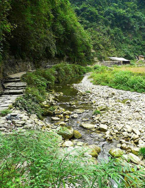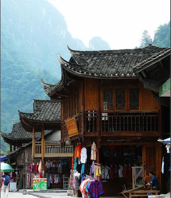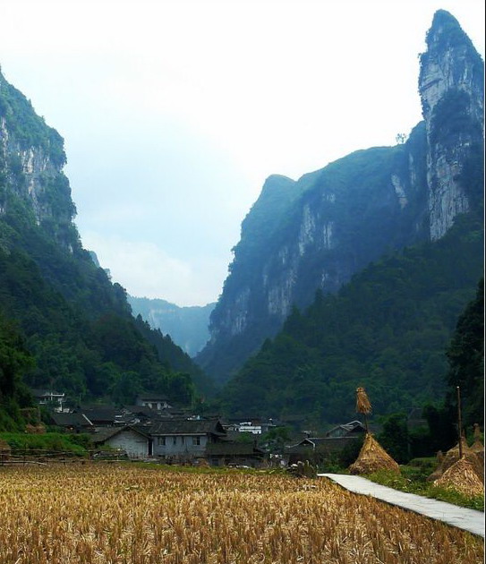 村寨四周山勢雄奇,絕壁夾天;“夯峽”、“九龍”、“玉泉”三溪在這里相會,如同三根彩帶在這里相交結(jié)。這里是風景區(qū)的中心,一萬五千多米長的青石板路從這里一直通向各個景點這里還是一個角度十分好的觀景臺,人立于此,只要原地轉(zhuǎn)動身子,就可觀賞到東西南北全方位的各個景點,那含情脈脈的“相依巖”、昂首奮蹄的“駟馬峰”、惟妙惟肖的“孔雀開屏”五彩繽紛的“彩云壁”和“屏峰”……盡在眼中無不景象萬千,令人目不瑕接。詩人石元機贊曰: