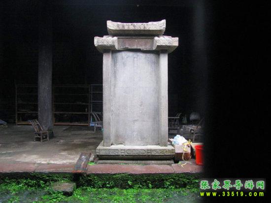 土司德政碑立于司城衙署遺址左側(cè),由青石雕鑿而成。碑高2.74米,寬1.2米,腹背刻字,上有石帽蓋頂,旁扶石柱。此碑是清康熙五十二年(公元1713年)2月永順土官為永順等處宣慰使彭泓海歌功頌德而建。碑頭篆書(shū)“甘棠遺愛(ài)”四字。正碑兩側(cè)有一對(duì)聯(lián):“一片石銘恩德厚,千秋歌頌山河新”。正中刻有“欽命世鎮(zhèn)湖廣永順等處軍民宣慰使司宣慰使都督府致仕恩爵主爺中涵德政碑”。碑文記述了所轄58旗、380洞軍民懷念彭泓海之德政以及“嘗聞恩可結(jié)民心,不能使民心之不忘記,功可顯當(dāng)時(shí),不能使后世之取法”的土司統(tǒng)治信條。
