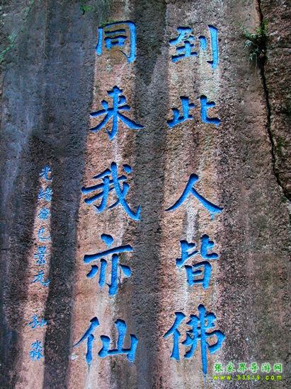 不二門內由石灰?guī)r風化形成的一尊巨大石佛,聳立于萬綠叢中,高六丈,青冠白面,頭頂白云,腳踏碧水,人們以其形神稱為“觀音巖”?!队理樋h志》稱“觀音巖素有‘湘景名峰第一巖’之稱”。觀音巖下,聳立著一組瑰麗多姿、古色古香的殿閣建筑群,這就是“嵩山堂”,包括三觀殿、玉皇閣和禪房客舍,工藝精巧,玲瓏別致。特別是正殿后的地藏庵,與老司城明代建筑祖師殿結構相似,背倚石壁,右通八陣圖,左達熱水坑,周圍怪石森列,古木參天。觀音巖北部山上是天造地設的“八陣圖”,有的如排戟,有的似春筍;有的像古佛,有的若走獸。八陣圖之奇,不僅在于它林立的怪石,最主要的是在于由龜裂紋石板鋪成的時上時下時隱時現(xiàn)的彎彎小徑——或穿過地下幽深的石洞,或延展于密林雜草叢中,或環(huán)繞于奇峰怪石之間,使八陣圖的東、南、西、北四門相通,復雜繁多的石徑互相連接形成網絡,人們有時難以找到出路。也許,這就是八陣圖命名的緣由。不二門內兩側石壁開闊如屏,歷代文人墨客或贊山水之幽絕,或抒心胸之豪情,雕鑿了種種摩崖石刻。據《永順縣志》記載,不二門石刻有神秀獨鐘、吾道南來、白云門開、砥柱中流、眼前南海、百寶勝光、別開生面、別有天地等100多處。歷經風雨滄桑之后,現(xiàn)僅存鬼斧神工、勝境無雙、滌盡塵氛、瞻奇仰異、海上飛來等數十處。清代名士白介庵所作《松徑留云》、《古洞仙蹤》、《層閣聳翠》、《玉嶂屏環(huán)》、《澄潭月影》等觀音巖八景詩尚凸現(xiàn)在石壁之上。其中《石門天鑿》一詩完整無缺:“法門高聳五云偎,鬼斧神工妙化裁。鞭石無痕還著相,振山有鐸不須錘。地沾花雨千歧坦,道接薪傳一線開。莫道終南稱捷徑,巨靈神辟小蓬萊。”清代庚辰年間的探花景元,曾在石壁上題刻“到此人皆佛,同來我亦仙”。他還以一筆揮成的“山青海岸”疊字如圖似的符合成一個“岸”字鑿刻在摩崖之上,堪稱罕世之作。石壁上近年來還鐫刻了偉人毛澤東的詩詞和儒將蕭克、黃永玉等巨擘的題字,游人置身其間,飽享山水美景、名勝古跡與文化藝術的熏陶。