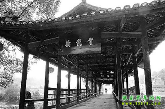賀龍橋原稱“永安橋”。飛架于賀龍故居右側(cè)玉泉河上,是一座石墩、木粱、騎廊的風(fēng)花橋。東西長(zhǎng)40米、寬7米、高8米。龍爪翹檐,中聳堡亭,8尊石獅,分置橋頭及石墩之上,造型渾厚古樸,富有民族特色。此橋原是溝通桑植內(nèi)外半縣的必經(jīng)之道,是上川鄂下津澧的要津,也是當(dāng)年鹽局奪槍、桑植起義的發(fā)端處。系賀龍?jiān)娓纲R廷宰首倡捐資修建,幾番修而復(fù)圮。至1916年,終由賀龍父親賀仕道襄修告竣。1929年冬,桑植“剿共”司令陳策勛,謂以破“賀氏風(fēng)水”,令毀此橋。解放后,桑植縣人民政府于1952年冬按原樣復(fù)修,命名“賀龍橋”。“文化大革命”動(dòng)亂中,林彪、“四人幫”誣陷賀龍,指使“紅衛(wèi)兵”毀橋,群眾奮起護(hù)衛(wèi),才幸免劫難。1983年5月,賀帥女兒賀曉明應(yīng)縣政府請(qǐng)求,得全國(guó)書法家協(xié)會(huì)秘書長(zhǎng)謝德萍書匾“賀龍橋”,高懸橋之東西首,永志紀(jì)念。1978年,賀龍故居及其生平業(yè)績(jī)陳列室、賀龍橋,列為省級(jí)重點(diǎn)文物保護(hù)單位。凡到賀龍故居、賀龍紀(jì)念館的游客這是必經(jīng)之地。