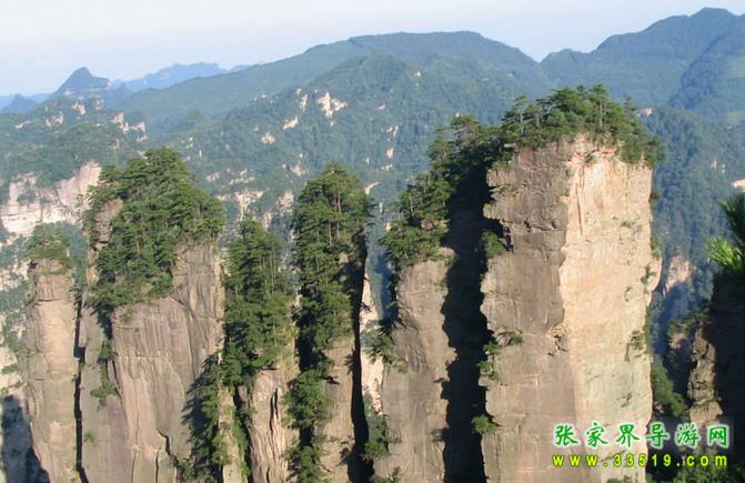 黃石寨西北崖沿下,6座高達200多米的橢圓形石柱,呈南北向一字排開在黃石寨與袁家界之間約2000米長的溝谷中。石柱大小和間距相當,柱頂皆為平臺,似一派待建橋面的橋墩。中間兩墩稍高,兩邊漸次降低。各柱頂可連成一條弧線,氣勢恢宏。橋墩下河床干涸,怪石嶙峋,樹木依稀,顯得古野、蒼涼。雨天,云霧滿壑,似一江怒濤,橋墩時隱時現(xiàn)。若逢東邊日出西邊雨時,便有絢麗壯闊的彩虹南北飛架,與橋墩形成雙美合壁的奇觀。