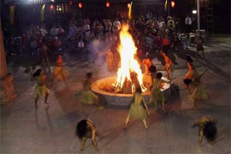 擺手舞的形式一般是這樣的:在擺手堂的中央高掛龍旗,四方點燈,由金童玉女給土家人用銅盆洗手,再從香火山取來神火,然后在龍旗下點燃3堆篝火。隨著3聲炮響,先由梯碼法師(巫師)手舉八寶銅鈴作前導,大家跟著翩翩起舞,徹夜不眠。