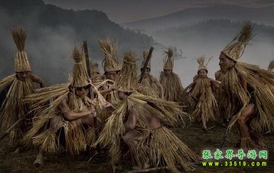 毛古斯,這是土家族最原始、最古老、最粗獷的一種歌舞。表演這種歌舞的人,全身上下裹稻草,腰纏稻草辮,前面還有一根用紅布包頭做的小圓棒。頭上也戴著由稻草扎成的草辮。領頭跳的叫“老毛古斯”,跟著跳的叫“小毛古斯”。其中一個扮演“古魯子”(類似騙子與歹徒),其余形象一般相同。演員們邊跳舞并發(fā)出“嗨嗨”之聲。舞蹈內容主要反映土家人古代原始生產(chǎn)斗爭,如打獵、捕魚等等。