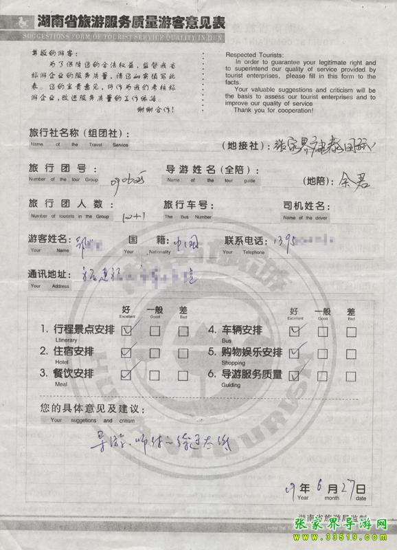 2009年6月25日福建邵先生一行12人接待質量反饋單: