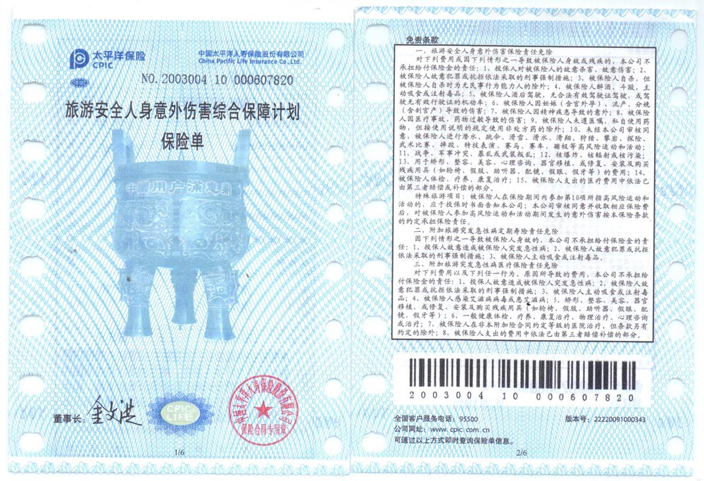 1、旅行社責任險;(從游客上了我社的安排的接待交通工具時到離開我們安排的接待交通工具時為止,不含客人來回湖南張家界地區(qū)的火車和飛機上的時間段);