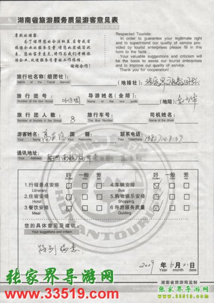 2009年6月18日高先生一行8人接待質量反饋單: