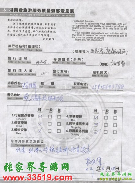 2009年6月25日安徽楊先生一行18人接待質(zhì)量反饋表: