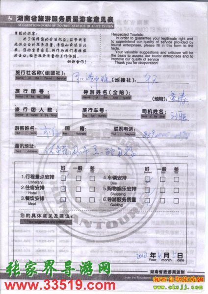 2010年4月5日河南李先生張家界旅游質(zhì)量反饋